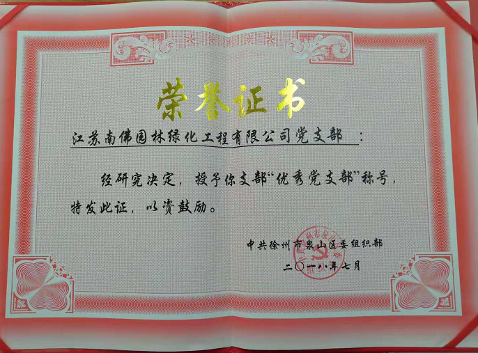 江苏9U在线绿化工程有限公司在2018年度党建工作中成绩优异,业绩突出,荣获“优秀党支部”荣誉称号。