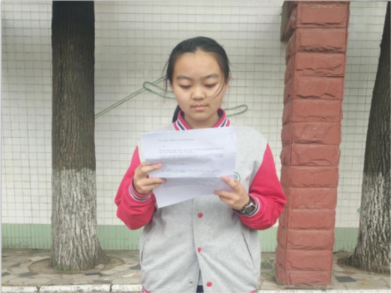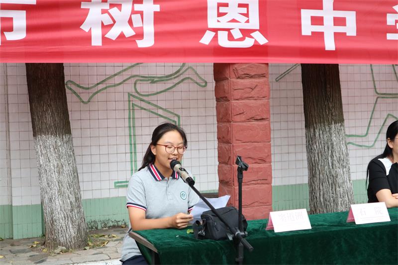 七5班李语凡同学发言:我们将用求知、拼搏的快乐来丰富我们生活的色彩,我们将用飞扬的青春、跳动的热情来续写树恩初中的光辉历史